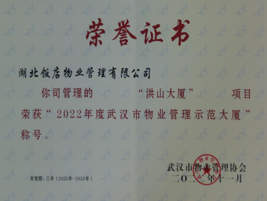 近日,武漢市物業(yè)管理協(xié)會(huì)公布2022年武漢市物業(yè)管理示范項(xiàng)目考評(píng)結(jié)果,湖北飯店洪山大廈項(xiàng)目獲評(píng)“武漢市物業(yè)管理示范大廈”稱號(hào)。