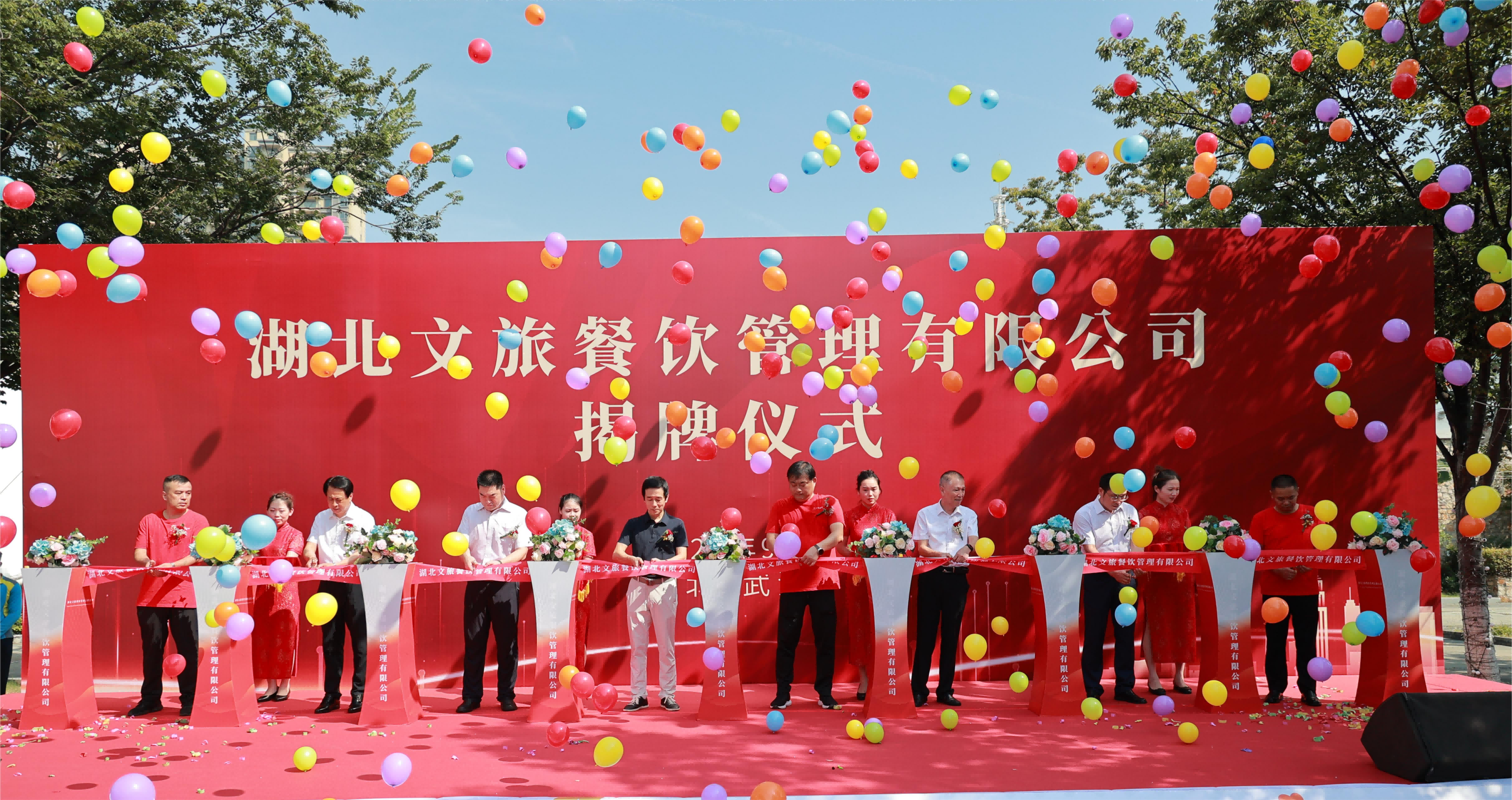 (圖為湖北飯店、湖北華鼎團膳和湖北文旅餐飲主要領(lǐng)導(dǎo)為湖北文旅餐飲剪彩)