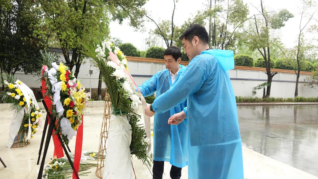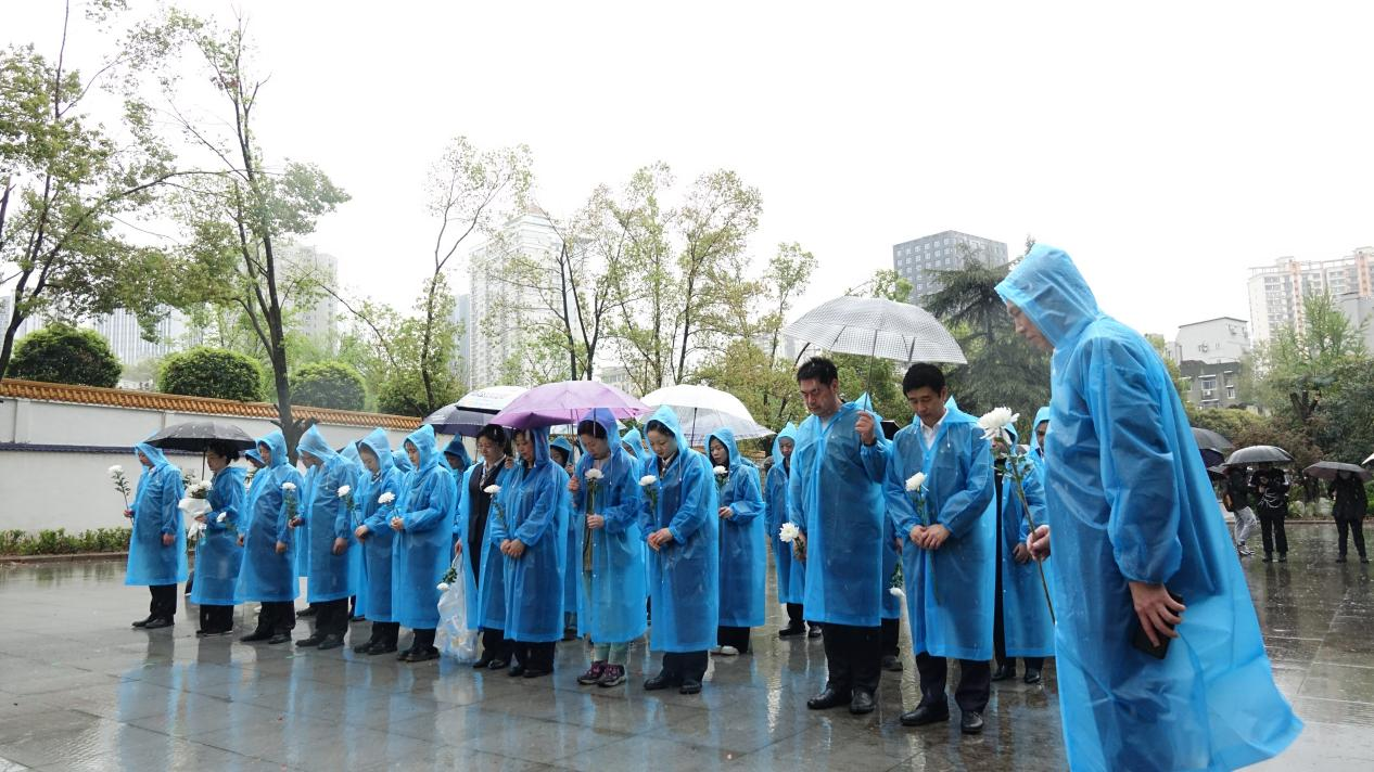 在紀(jì)念碑前,大家接受著雨的洗禮,集體向革命烈士默哀,并敬獻(xiàn)花籃,以表達(dá)對(duì)他們的深切緬懷與敬佩之情。