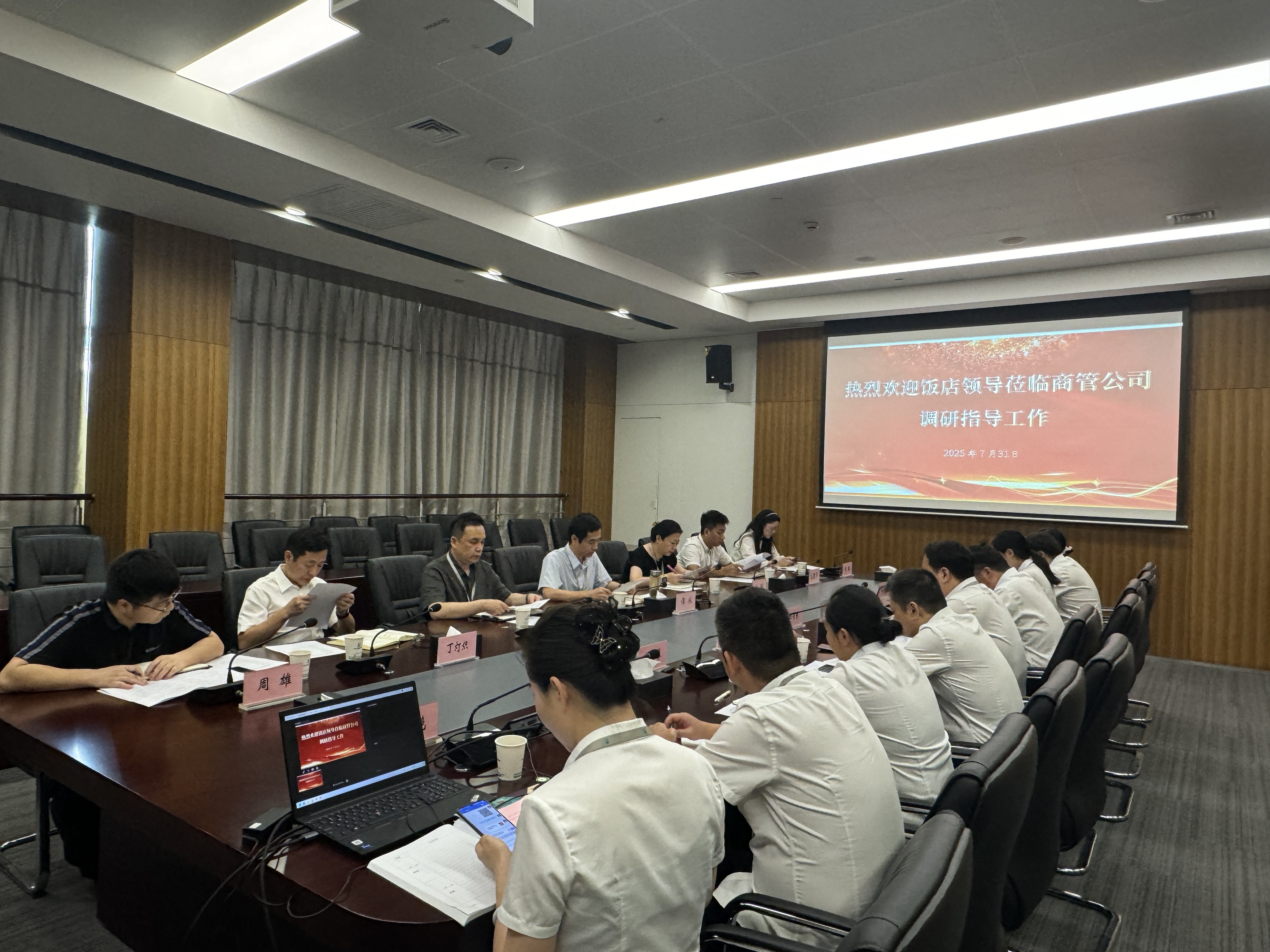 飯店領(lǐng)導(dǎo)喻瓊、王文山及本部相關(guān)部室負(fù)責(zé)人參加調(diào)研座談。