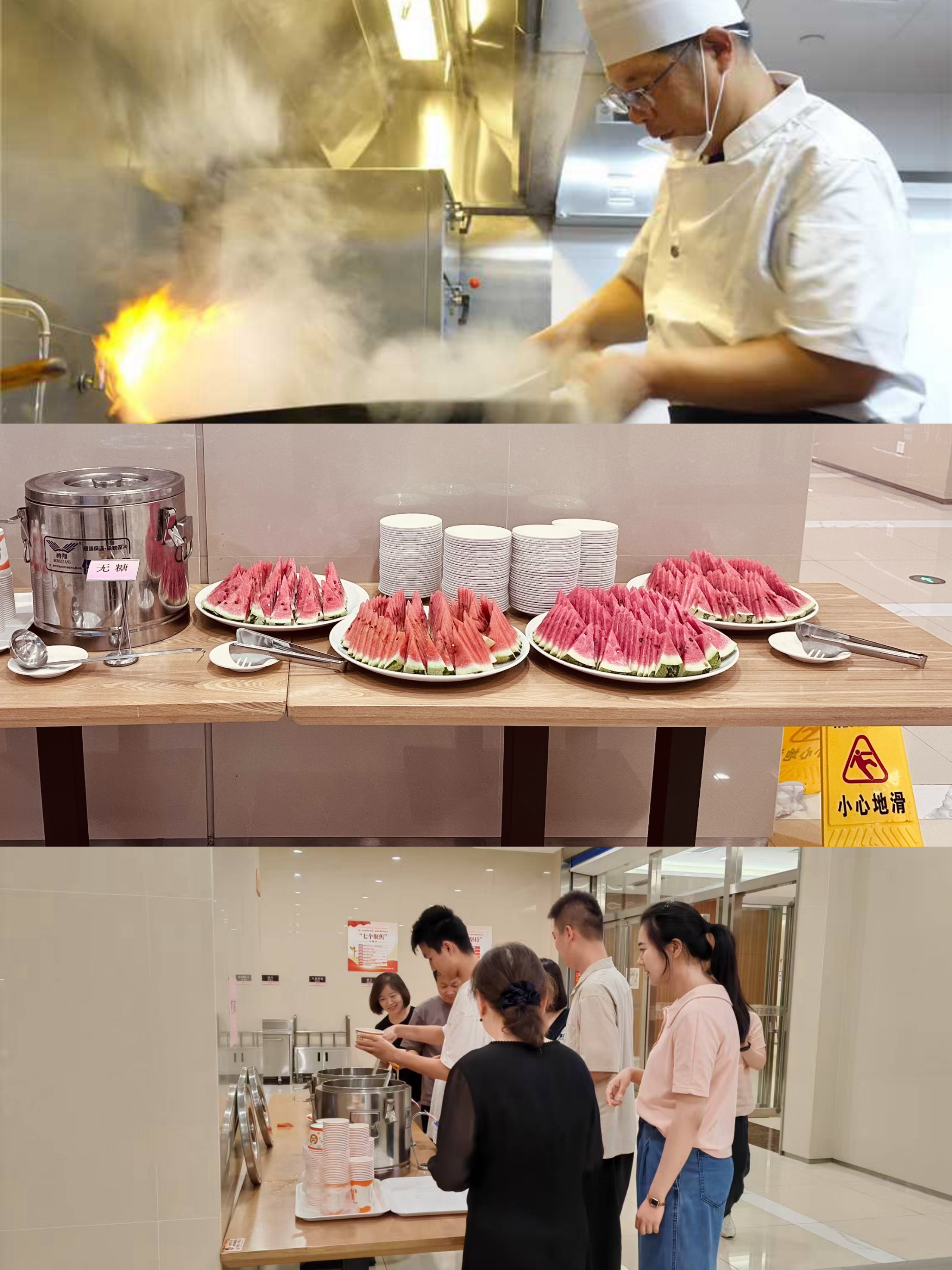 湖北文旅方辰商業(yè)運(yùn)營(yíng)管理有限公司餐飲服務(wù)先鋒隊(duì)秉持“民生無(wú)小事,枝葉總關(guān)情”的服務(wù)理念,讓服務(wù)更有溫度、更具力度。盛夏時(shí)節(jié),他們不畏高溫炙烤、油煙籠罩,堅(jiān)持力度不減、標(biāo)準(zhǔn)不降,精摘、細(xì)切、勤洗、煎、炸、烹、炒,保質(zhì)保量完成每道菜的制作流程,洗鍋、倒油、下主料、添配菜、調(diào)味等一連串?huà)故斓膭?dòng)作仿佛早已練就不怕“烤”的真功,只為奉獻(xiàn)一道道美味菜肴。在暑期,他們溫馨設(shè)置了送清涼服務(wù)站,擺放了西瓜、綠豆湯等降溫食品及藥品補(bǔ)給,為入駐單位送去了絲絲涼意和暖心服務(wù),入駐單位職工們紛紛拍照并轉(zhuǎn)發(fā)朋友圈,為他們的精致服務(wù)點(diǎn)贊。